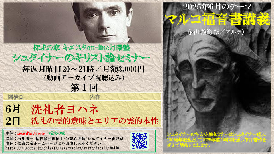 キエスタon-line月曜塾【シュタイナーのキリスト論セミナー】6月『マルコ福音書講義』第1回「洗礼者ヨハネ~洗礼の霊的意味とエリアの霊的本性」