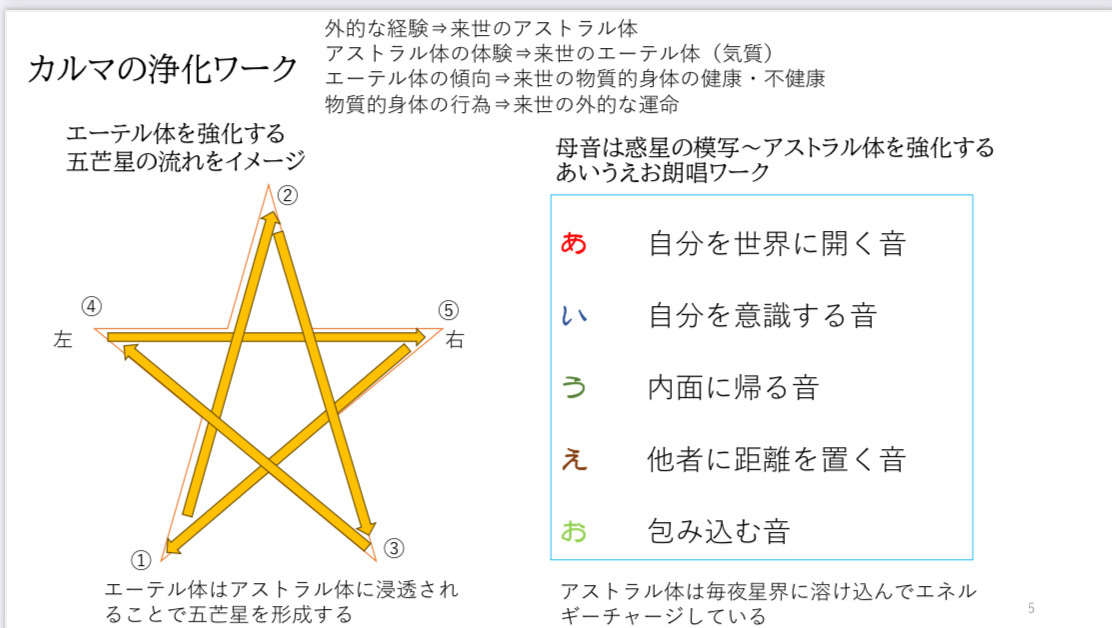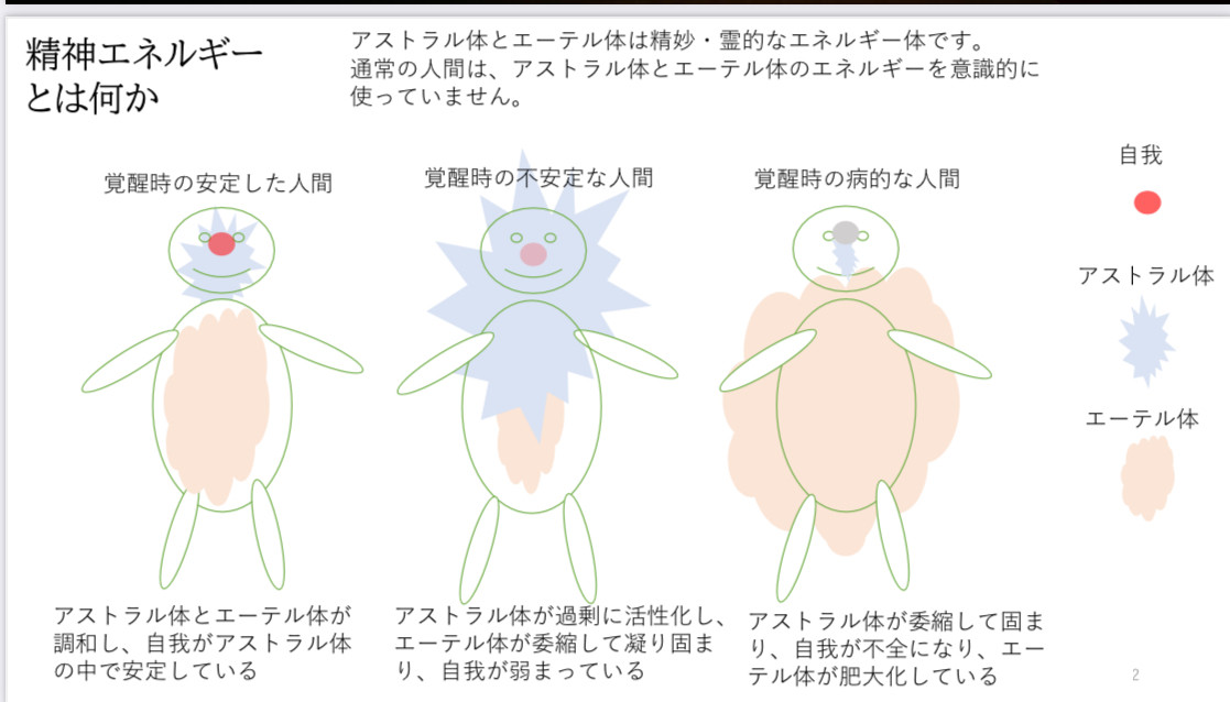まずは、精神エネルギーとは何かについて、学びました。アストラル体とエーテル体は精妙、かつ、霊的なエネルギー体です。通常の人間はアストラル体とエーテル体のエネルギーを意識的に使っていません。シュタイナーによると、睡眠中、物質体(肉体)から、自我とアストラル体が肉体かは離れて、宇宙に拡がり、宇宙法則を取り込むことで、アストラル体が回復し、肉体に戻って、エーテル体を再生させると言われています。私たちは、アストラル体で受けた印象をエーテル体に記憶をさせています。覚醒し続けることで、アストラル体は破壊され、睡眠中に再生することから、エネルギー循環を良好にすることで自己免疫力を高めることができることを学びしました。