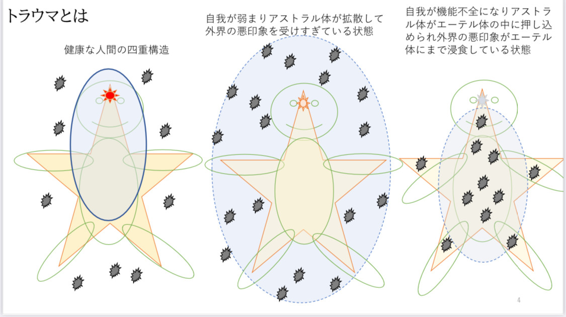 また、トラウマとは、エーテル体に刻み込まれた記憶であると言われています。自我が弱まり、アストラル体が拡散して、外界の悪印象を受けすぎている状態のとき、ストレスを避けて、休養することが必要になります。自我が機能不全になり、アストラル体がエーテル体の中に押し込まれ外界の悪印象がエーテル体にまで侵食している状態が続くとトラウマになります。エーテル体の浄化力、自己免疫力が低いとトラウマになりやすく、前世、幼少時の影響を受けていることが考えらます。