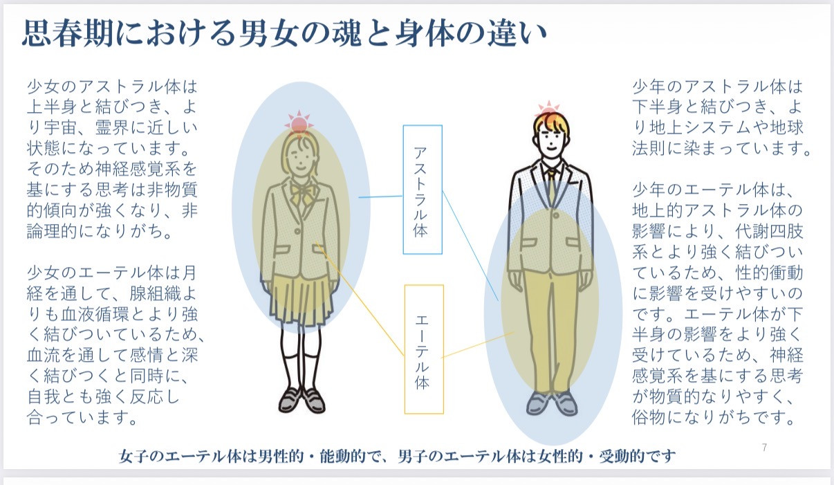 この自己意識もしくは自己感情が、自分の肉体の中で生じるか、エーテル体の中で生じるかによって、性的アイデンティティが育成されます。