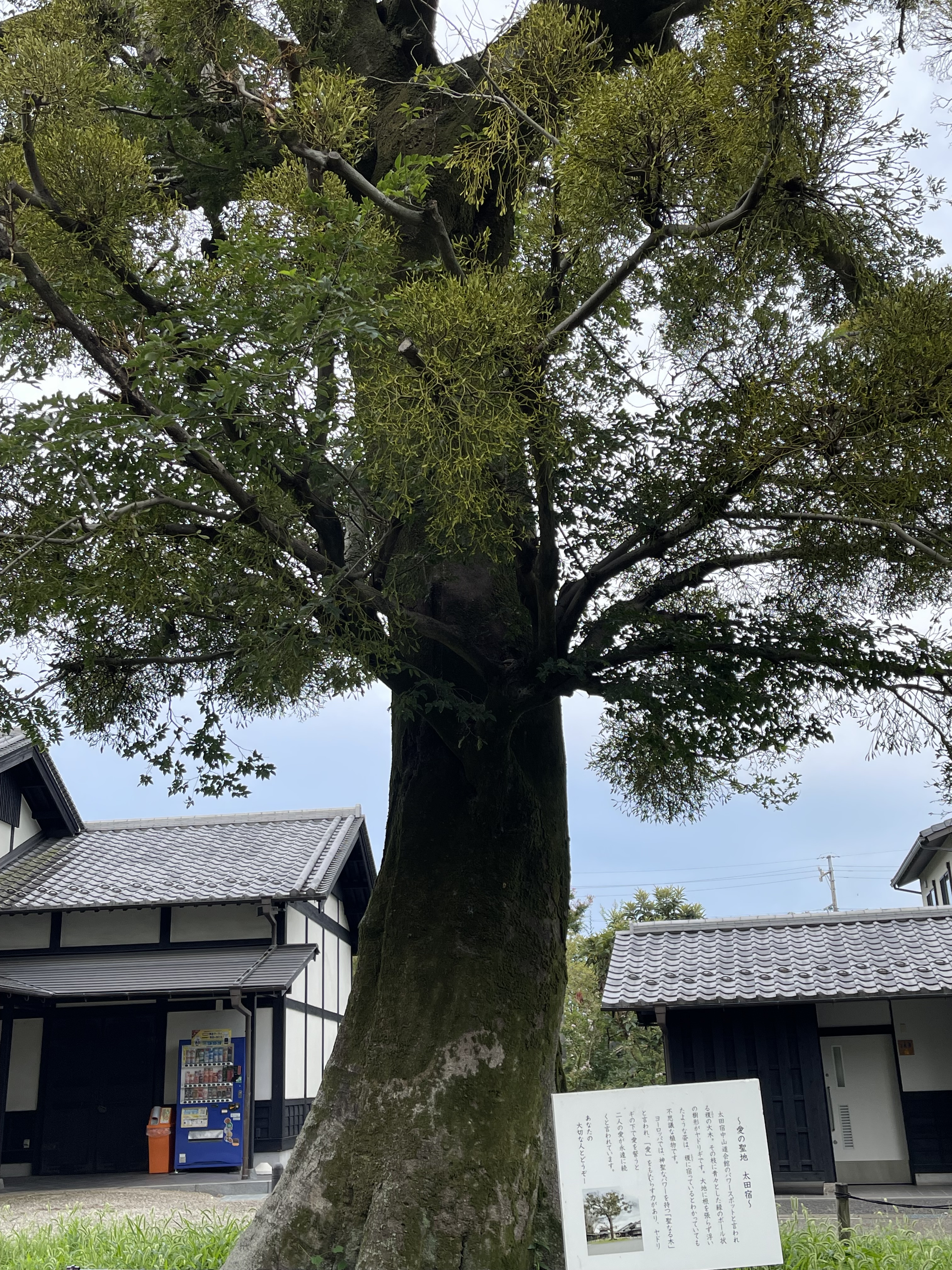 中山道会館の中庭には、「中山道太田宿」を江戸時代から見守ってきた樹高18mのエノキがあります。花言葉「共存共栄」を体現するように、枝の至る所に「ヤドリギ」を寄生させています。