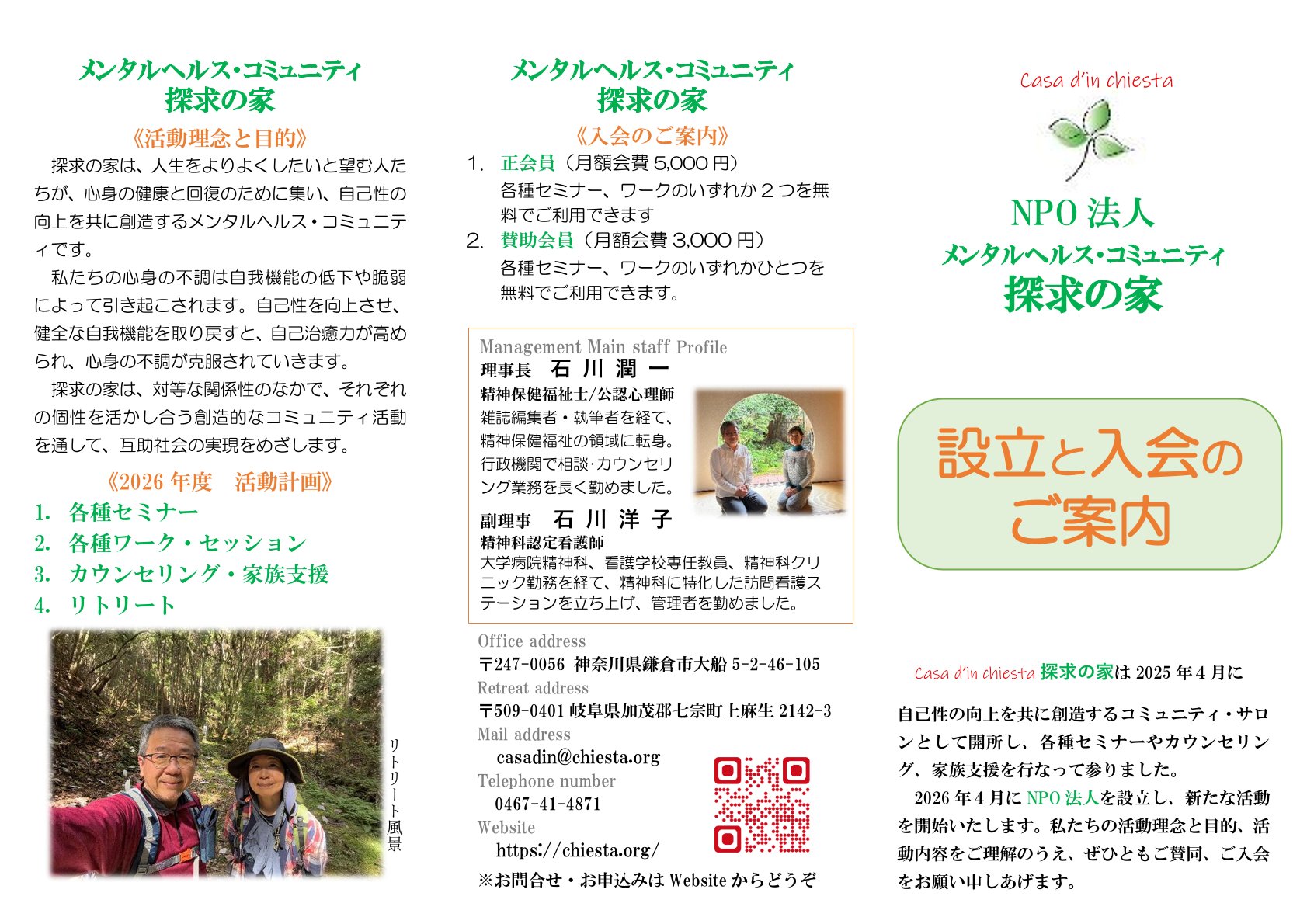 NPO法人メンタルヘルス・コミュニティ探求の家 設立と入会のご案内