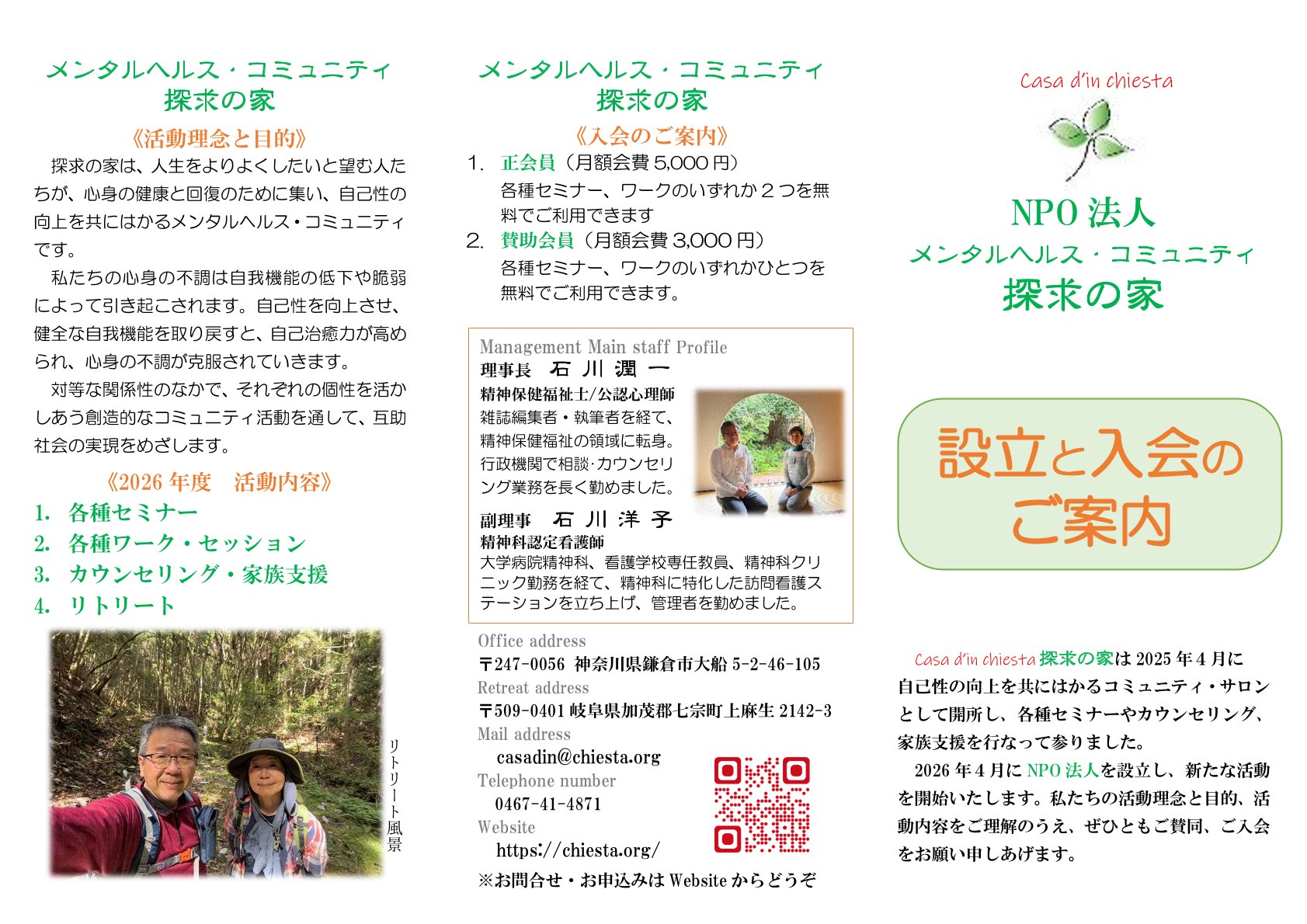 NPO法人メンタルヘルス・コミュニティ探求の家 設立と入会のご案内
