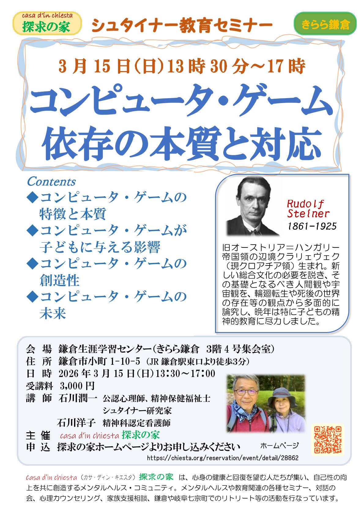 シュタイナー教育連続セミナー2026年3月15日【コンピュータ・ゲーム依存の本質と対応】@きらら鎌倉
